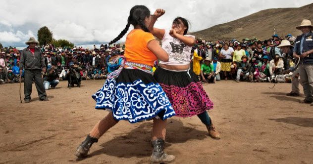 Takanakuy大致意思是“当血液沸腾时”。它发生在圣诞节的秘鲁Chumbivilcas省。在仪式上,包括黑人在内的五个传统角色被描绘出来。这个角色是秘鲁殖民时期的奴隶主,他像公鸡一样绕着圈子跳舞。这些仪式很好地构建了节日的主要活动——战斗。人口约300的Chumbivilcas这个小省,在这一事件中看到了大量的游客。超过3000人聚集在一起观看这场拳击。多年来发展起来的不和已经在这里解决了,欢迎大家参与。看到妇女和孩子参加比赛并不少见,但大部分都是男性。拳头被包裹在布里,比赛结束时,对手被击倒,或者裁判介入。裁判员们还携带着鞭子,让战士和人群不要太疯狂