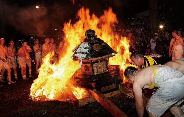 这个节日也被称为“火与暴力节”,在七月的第一个星期五和星期六举行。这些奇怪的仪式主要是由米酒推动的,它被鼓励引起混乱,因为这将会使萨诺诺-诺-米科托,海神和风暴之神。周五,一场灯会在日本的一个村庄举行,终点在码头。在那里,灯笼的载流子被悬挂在杆子上的大火灾迎接。当它们燃烧时,它们的灰烬像雪花一样滑翔下来。男人和男孩在地下跳舞,打鼓、铃铛和笛子。没有比那混乱的笛声更重要的了。在第二个晚上,人们的注意力集中在两个便携式神龛的毁灭上,因为狂欢者们会游行到静止的Yasaka神社。这些可携带的物品被扔进了道路和河流,并承受着它们的公平份额。无论剩下的是什么,都被放置在Yasaka神殿的前面,并被燃烧着的火把打碎了几个小时,以获得精神上的帮助。