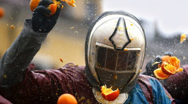 意大利Ivrea市一年一度的橘子之战的起源尚不清楚。传说在12世纪,这个城市被一个特别肮脏的侯爵统治着。在权力的狂热下,他试图强奸当地磨坊主的女儿。她最终将他斩首,并引发了一场起义,宫殿被夷为平地。这个节日是这次起义的重演。只有用石头和其他的炮弹来对付马奎斯的人,现在战斗只剩下橘子。在大街上,为那些想参加庆祝活动的人准备了一箱水果。从那里,你只需要等待马奎斯的人通过,就会被令人惊讶的顺从(当然是吓坏了)的马引导。虽然他们确实会还击,但你将忍受的最可能的伤害来自于朋友的友谊,因为橙子从一边到另一边。如果你曾经吃过橙子,你就知道他们会留下令人印象深刻的瘀伤。仅去年一年,就有至少70人因受伤而接受治疗。