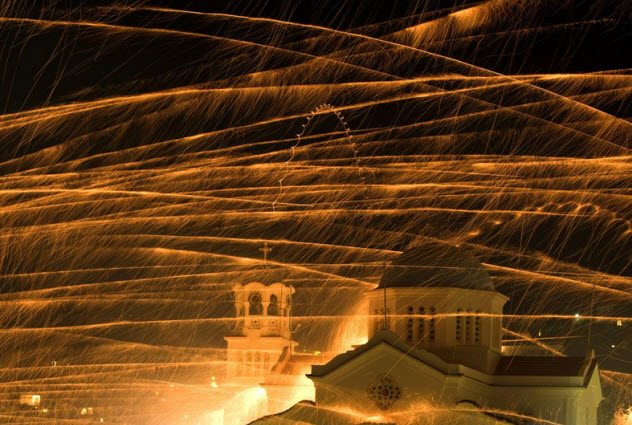 在希腊的Vrontados,复活节夜晚不是平静的时候。两个相互竞争的教堂(圣马克和帕格尼亚。埃里希亚尼)几个世纪以来一直在相互竞争。每年,两家教堂都试图通过在对方的方向发射烟火来解决这个问题。失败者是最先被钟声击中的教堂。我们猜测,对于赢家炫耀的权利。找个借口在钟里放烟火是很有趣的。此外,记录钟声并不是科学的,这意味着两家教堂每年都宣称胜利。不是每个人都喜欢庆祝活动。周围的建筑必须用金属板保护,否则会受到严重损害。火灾经常发生,最糟糕的是导致死亡。2016年,由于安全问题,该活动被取消。一位当地男子说:“很多人都抱怨火箭战争每年造成的损失。但这些人并不多,我想只有20人。我希望……这一传统将继续下去。