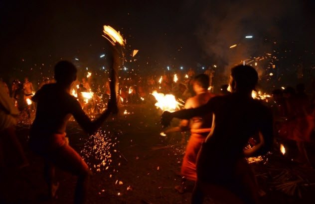 在印度的芒格洛尔,虔诚的印度教徒聚集在一起,用燃烧的棕榈树叶相互投掷,以安抚女神杜尔加。与会者在当地河流聚会,进行集体和精神上的重大清洗。然后是玩一些燃烧的dodgeball的时候了。参与者分成两组。从那里,手掌制造的火炬被投掷到对方的一边。被击中的人越多,杜尔加的印象就越深刻。官方规定,每个参赛者只允许投掷5次,但交火持续约15分钟。这意味着许多火把被回收,表明杜尔加在规则上是一个疲惫不堪的女神。尽管如此,还是有裁判在场,以确保人们不会太受伤……在被燃烧的棕榈叶的同时。在15分钟后,参与者们步行前往Kateel Durgaparameshwari神庙,在那里又发生了一场快速的交火,受伤的人被淋上了圣水,[3]