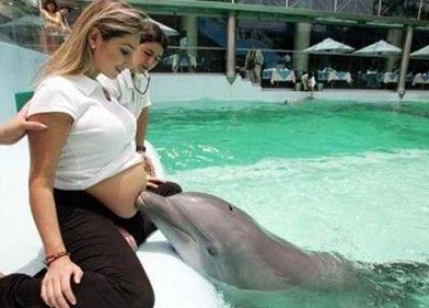 秘鲁首都利马,一名怀有8个月身孕的妇女接受海豚疗法。据说海豚的超声波可以刺激腹中胎儿的成长和脑部发育。
