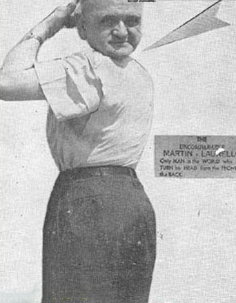 马丁·乔Laurello(1885年至1955年),又名“人类猫头鹰”或“旋转头男人”,这名男子出生于1885年5月德国纽伦堡。他出生时脊柱扭曲,导致他的头可以完整的旋转180°。当他的头转向的时候,实际上他的脊椎是呈现问号的形状。他娶了阿梅利亚爱墨林,并且是纳粹同情者。