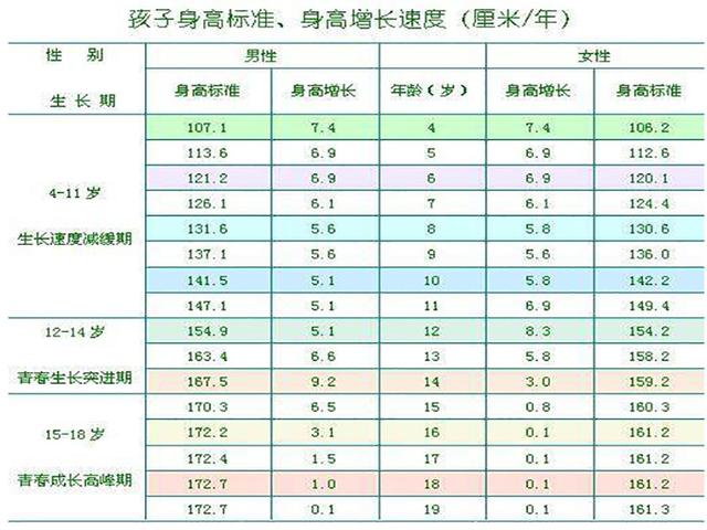 很多妈妈们会疑惑,到底自己的孩子有没有出现骨骼年龄早熟的情况,在这里小编特点给你们找来了4岁到18岁各年龄段的平均标准身高参考,妈妈们可以自行对号入座,看看自家的孩子有没有身高异常的情况。一般情况下,孩子们大多在14岁时进入青春期,但在进入青春期前,如果发现孩子长得太快,远远超出平均水平,就需要引起注意了。
