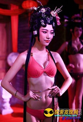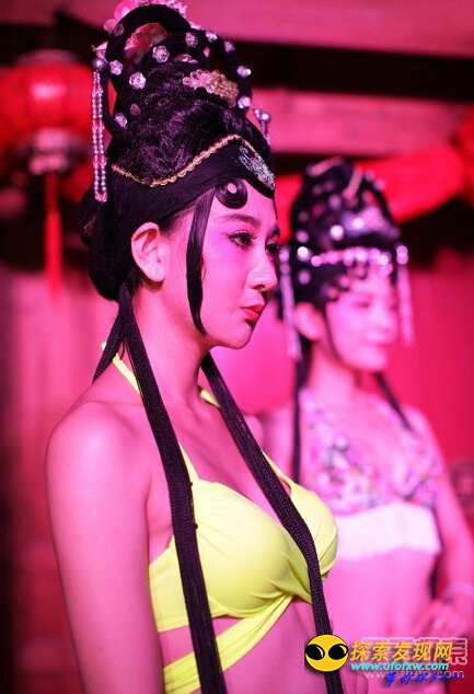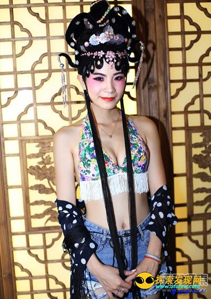 模特们,头部是传统的戏曲扮相,身上穿的却是开放的比基尼