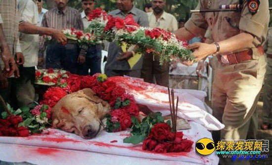 图中狗只为 Zanjeer,牠在过去曾多次检测中找出 3,329公斤炸药、600 枚雷管,249 枚手榴弹,6406 发实弹,拯救成千上万人的生命,并于 2000 年死后获风光大葬 by STR News / Reuters