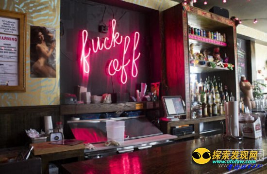 值得一提的是,诺斯还在酒吧内安装了一盏漂亮的霓虹灯,上面用粉色荧光线写着“滚蛋”二字。也就是说,如果有谁胆敢败了你的兴致,这个霓虹灯便是你的逐客令。