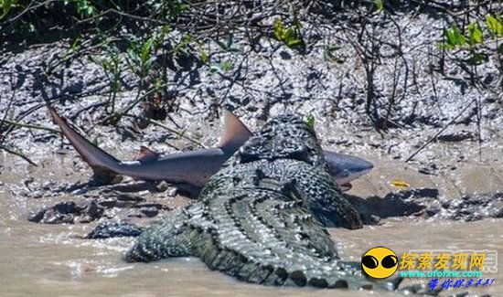 据悉,一条5.5米的巨型鳄鱼将鲨鱼拖至岸边,当时鳄鱼狠狠地咬了鲨鱼几次,鲨鱼曾试着挣扎,几次返回水中拍打着海水,但最终还是被鳄鱼活活咬死,结束战斗之后,鳄鱼将鲨鱼尸体拖至岸边的红树林,慢慢享用这一美味。