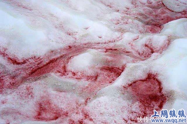 这被叫做“红雪”,也叫“西瓜雪”,据说尝起来有西瓜的味道。早在多年以前,科学家们就发现了一种高原藻类,而这些“红雪”,正是由雪衣藻、溪水绿球藻和雪生纤维藻等高原藻类组成的。即使到了零下40度,这些高原藻类依然可以生存。因其含有血色色素,故呈红色。