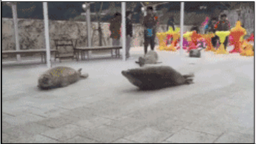 斑海豹在登陆后只能依靠前肢和上体的蠕动,像一条大蠕虫 一样匍匐爬行,步履艰难,跌跌撞撞,十分笨拙可笑,活动的范围也不大。