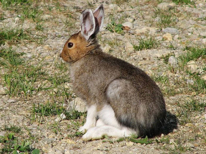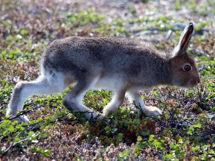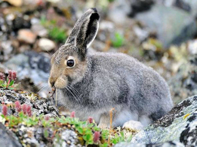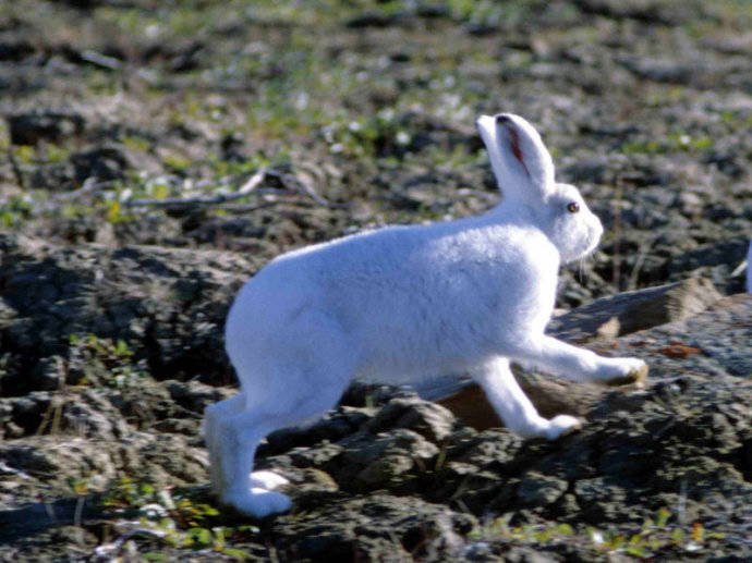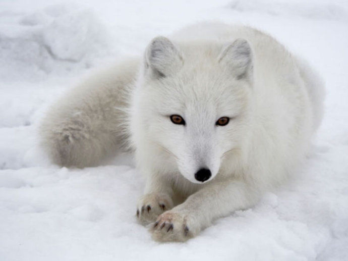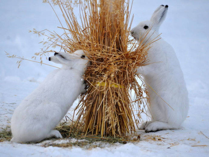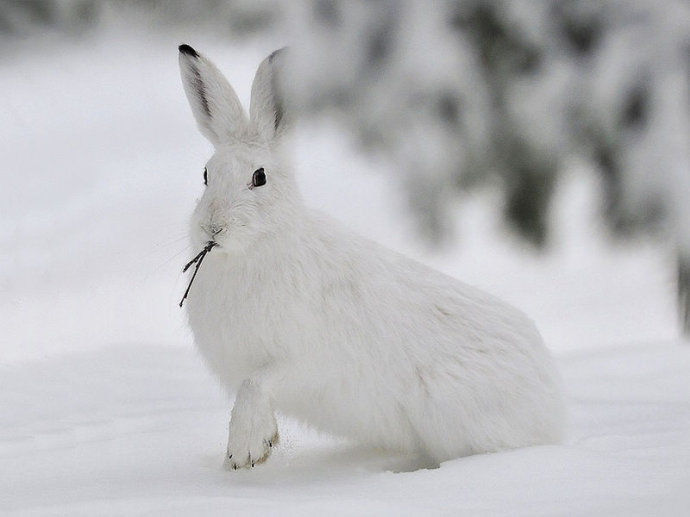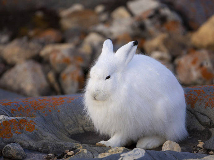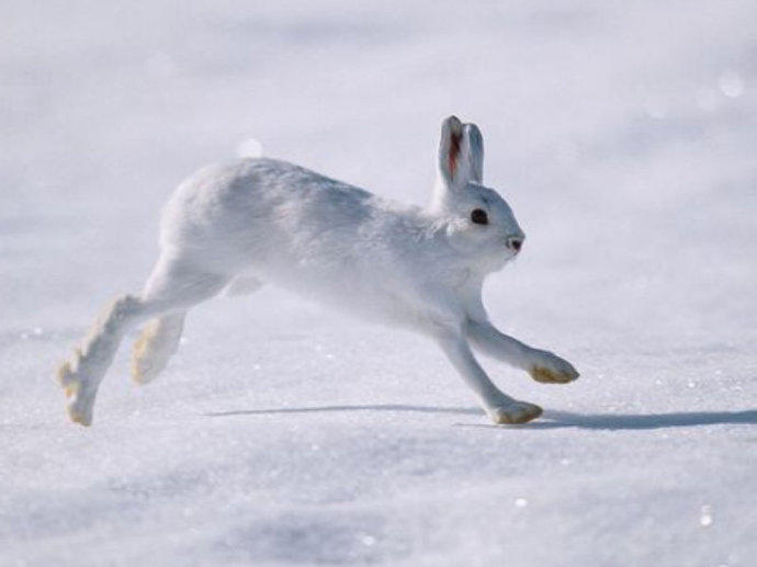 北极狐是非狐属中最著名的物种,也是民间传说中的白狐,外形似狐,体型较小可爱。与北极狐同样为北极土著的还有著名的北极熊、北极狼、麝牛(具体见动物世界:山寨还是原创之九)。兔形目兔科兔属的北极兔(见上图),别名蓝兔、山兔,一般体长为55-71厘米,体重为4-5.5公斤,体形比家兔大,身体肥胖,耳朵和后肢都比较小,有的无尾,曾被视为雪兔(见上图)的亚种,现独立成种,分布于加拿大北部和格陵兰的冰原上,亚种4个。北部地区的北极兔毛色终年为白色;而南部地区的平时为灰褐色,尾为白色,到冬天时毛色变为白色。繁殖率低,但存活率较高,主要以苔藓、植物、树根等食物为食,但有些北极兔偶尔也会吃肉。北极兔与北极狐一样能变色,同样的还有分布于北美的白靴兔等动物。