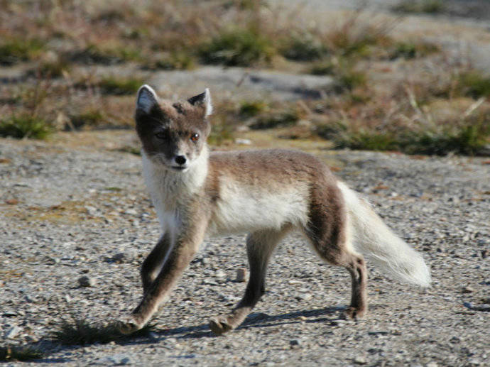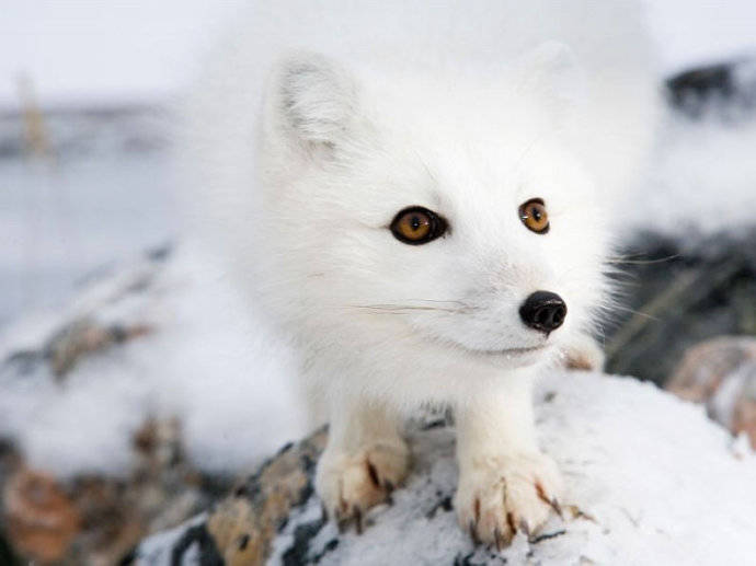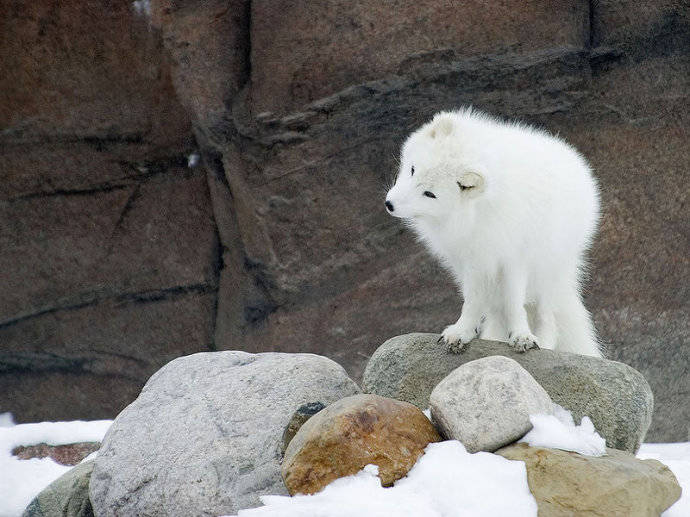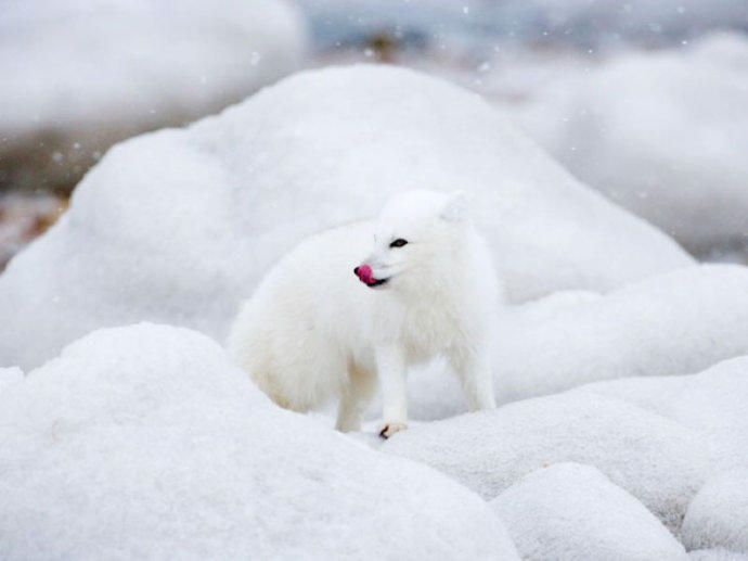 北极狐主要以旅鼠为食,也捕食北极兔、鱼、鸟类、雀蛋、果实,有时会漫游海岸捕捉贝类。在北极同北极熊一样为陆生的土著。