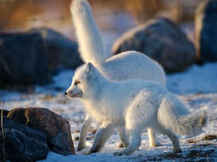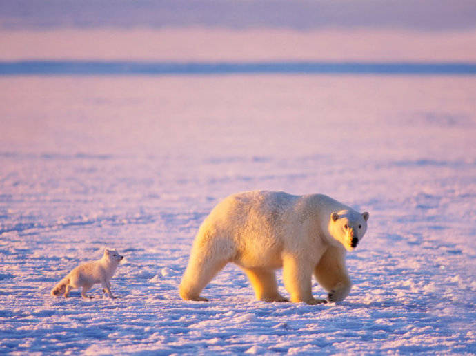 冬天当巢穴中所储存的食物被消耗殆尽时,北极狐会跟踪北极熊,拣食北极熊所吃剩的残羹剩饭。冬天里北极熊身后总会有2到3只白狐在悄悄地跟踪。但当北极熊非常饥饿时,也会攻击北极狐,杀死北极狐。
