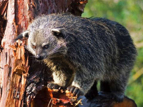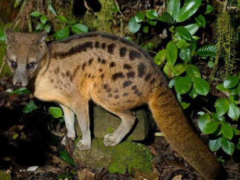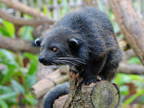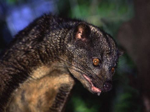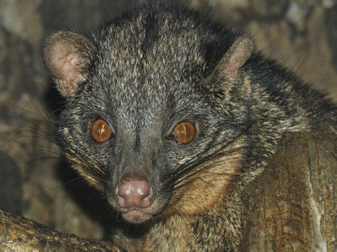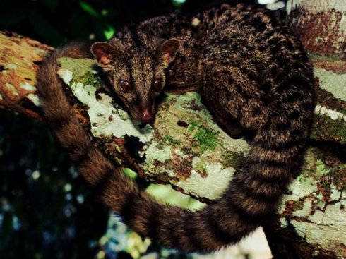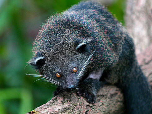 双斑狸属单一物种双斑狸(见上图),别名非洲椰子狸、二斑灵猫,体重1.7-2.1千克,体强壮,毛发直立粗糙,尾强而有力,长度与躯长相等,四肢短小有力,耳小,眼黄绿色,毛厚呈褐色、浅棕色或黄色,带有深色斑点,每个足的第三趾和第四趾之间有腺体,下腹部也有产生气味的腺体,用以标记领地。分布于非洲东部丛林中,夜行性,在黄昏后和黎明前活跃,杂食性,主要以水果为食,也吃啮齿动物、昆虫,鸟蛋、鸟类、果蝠、腐肉,也因捕食家禽而遭当地农民大量猎杀。熊狸属单一物种熊狸(见上图),外形似小熊,四肢粗壮,体长70-80厘米,尾长接近等于体长,体重8-13千克,为灵猫科第二大种类,雌性体形比雄性大出20%。五趾有坚强锐利的爪,尾端具缠绕性,能缠住树枝支撑身体觅食。毛被长而稀疏,粗糙而蓬松,通体黑褐色,毛尖染棕黄或棕灰色,分布于东南亚,亚种3个,栖于热带雨林和季雨林,树栖,夜行性。主要以果实、鸟卵、小鸟及小型兽类为食,尤喜榕树果实,我国熊狸的数量估计已不及200只,处于高度濒危状态,为国家一级保护动物。