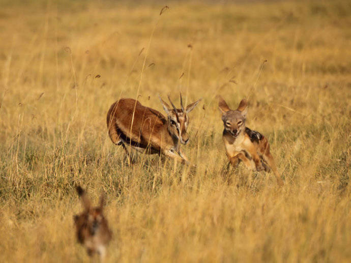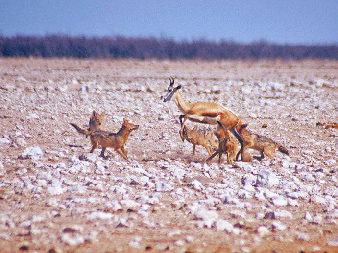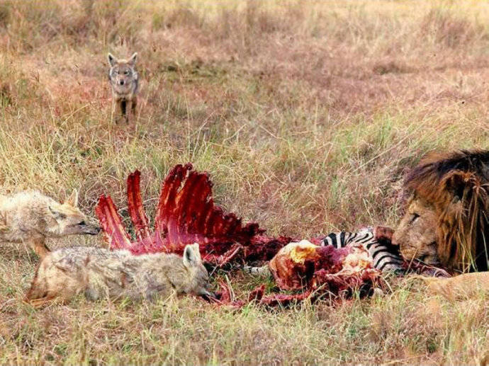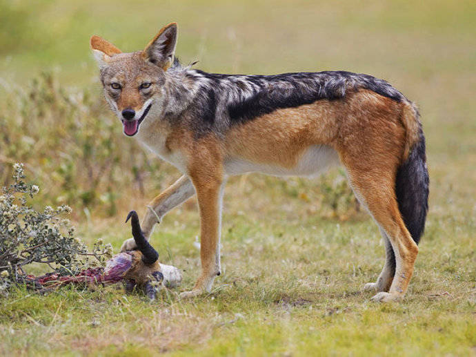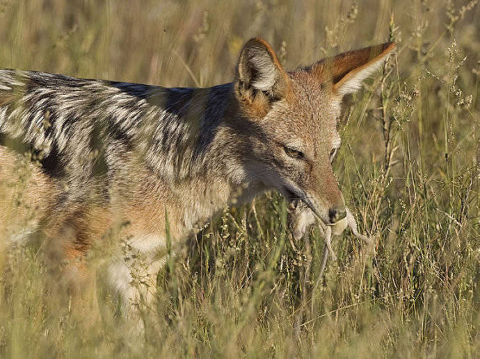 胡狼脚长,犬齿弯曲,适合猎食细小哺乳动物、鸟类及爬行动物。脚掌较大,肢骨融合,适合长距离奔跑,并可以维持每小时16公里的速度。胡狼与北美洲的郊狼有相似的生态位,专门捕猎细小至中等的动物。黑背豺善于投机,行动敏捷,通常在狮子旁边等候,趁狮子不注意时偷走食物。有时跟随鬣狗、非洲秃鹫,从中分一杯羹,适应能力很强。
