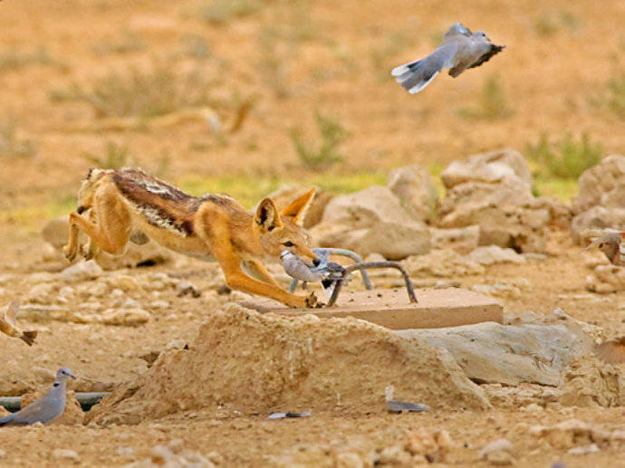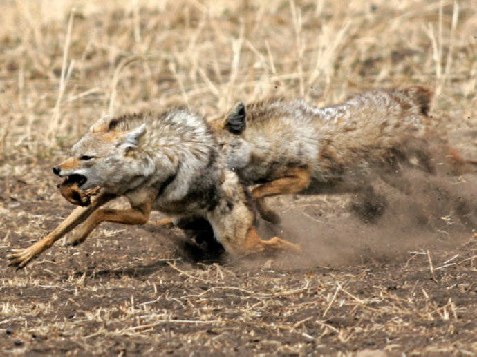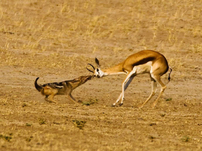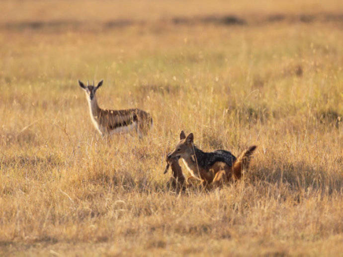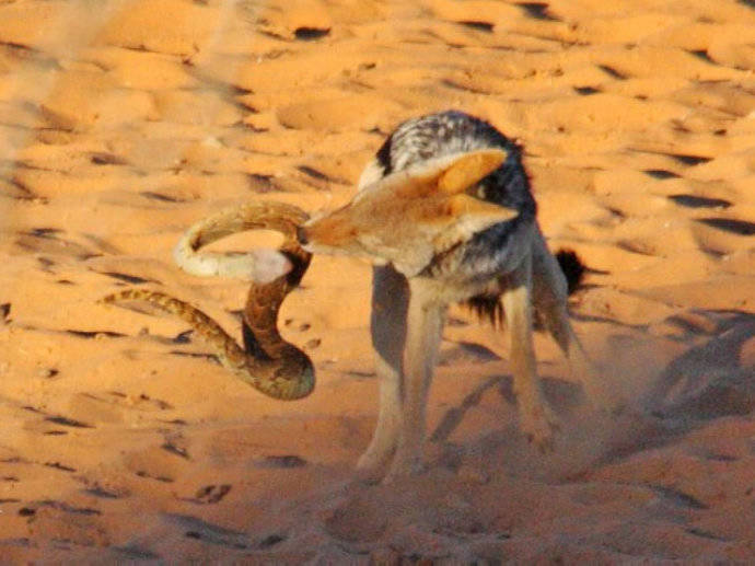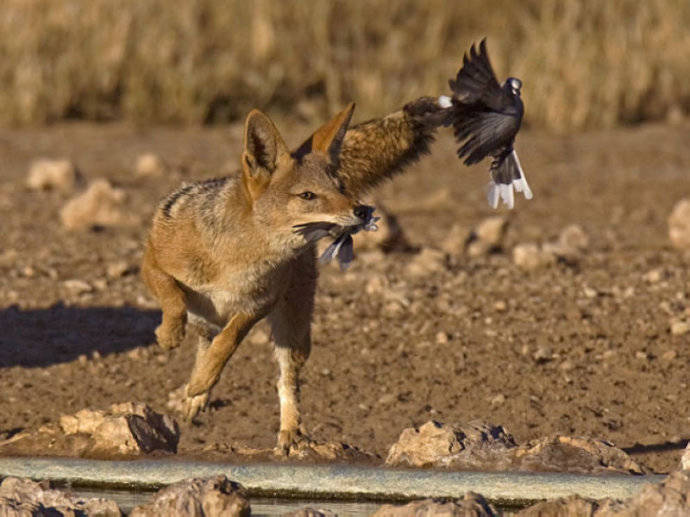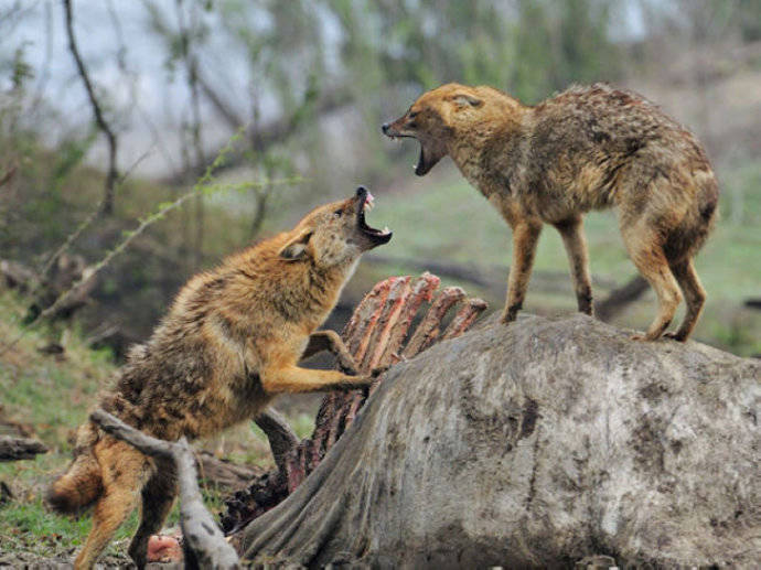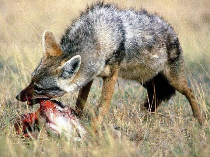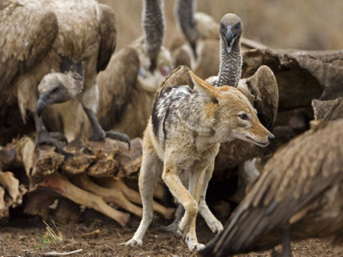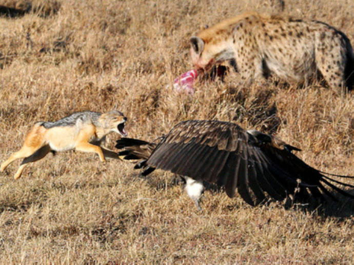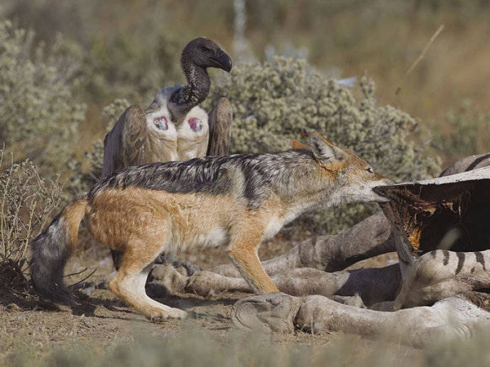胡狼的体形比豺稍小,主要食物是一些比较容易寻找和捕捉的小动物,如蜘蛛、甲虫、小鸟等,常跟随秃鹫捡拾动物死尸。黑背胡狼常与秃骛之间经常火拼,不过秃骛仍需胡狼,因为秃骛尽管有着尖硬的嘴,但缺少自己撕碎兽皮的力量,只有等胡狼扒开死尸外面的那层硬皮,才蜂拥而上,并常常把胡狼挤走。胡狼也通过秃鹫发现动物尸体从而分一杯羹,二者合作而竞争,演绎着大自然生存法则。