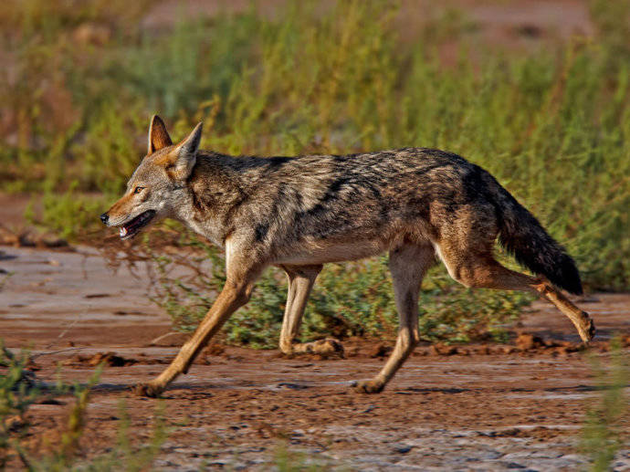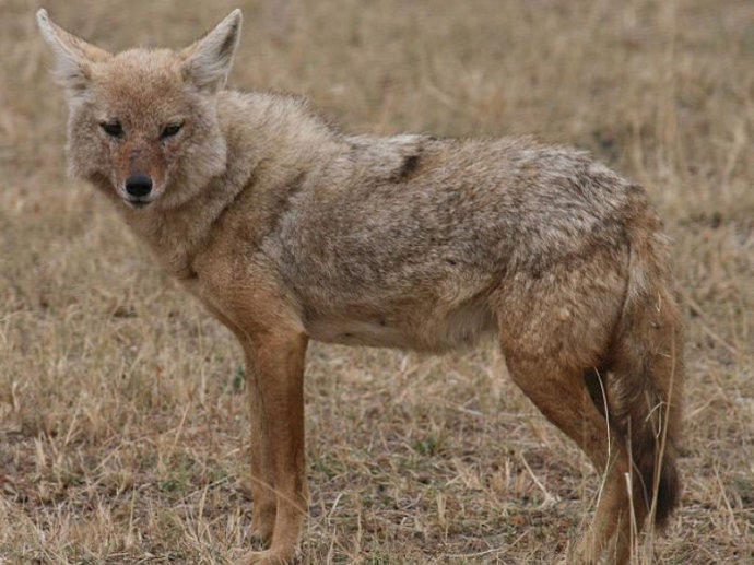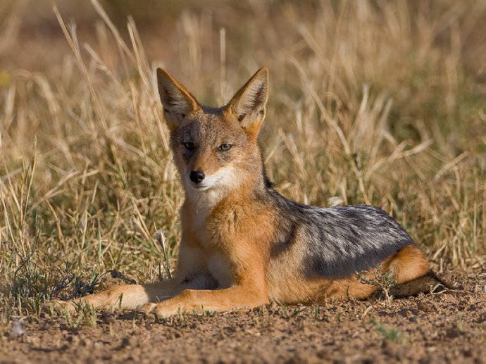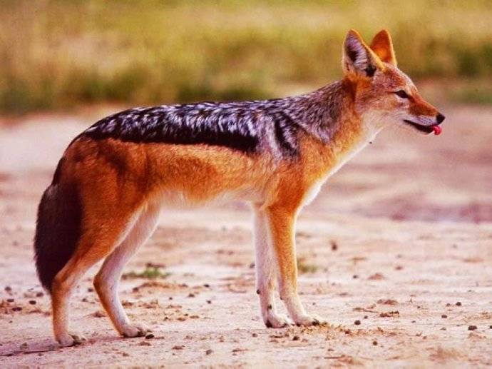 犬属的黑背豺(见上图),别名黑背胡狼,不含尾长成体长60-90厘米,肩高30-48厘米,尾长26-40厘米,体重9-14千克,因背部黑色而得名。雄性体重6.8-13.8千克,雌性体重5.4-10千克。外形似狐狸,头骨与侧纹豺相似,但宽阔而不平,比金豺体长肩高但头小体轻,毛色为红棕色至棕褐色,侧面和腿部都偏红,背部黑色,腹部白色,尾尖黑色,尾部毛发长达7厘米。