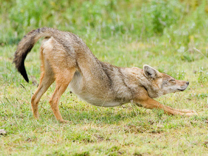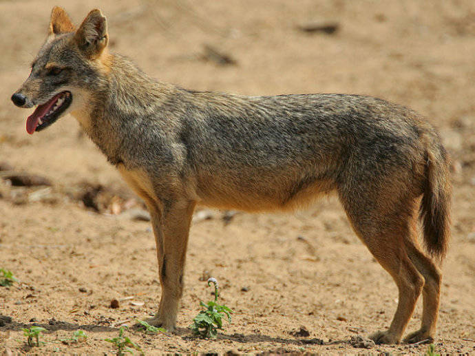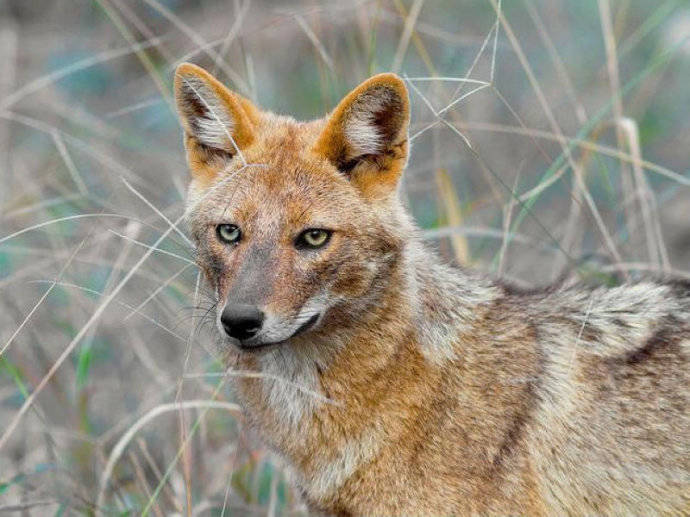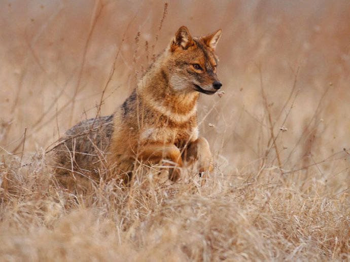 犬属的金豺(见上图),别名亚洲豺、普通豺,不含尾长成体体长60-106厘米,尾巴长20-30厘米,肩高44.5-50厘米,雄性体重6.3-15千克,雌性体重7.0-11.2千克。外形似狼,身体瘦长,额头较狼更尖,头骨似狼而薄,毛比较长,通常是黄色、近乎白色的淡黄或者棕色,随着分布环境和季节的不同而不同。一般雨季颜色深,旱季颜色浅。也有个体是黑色的,但很稀少。