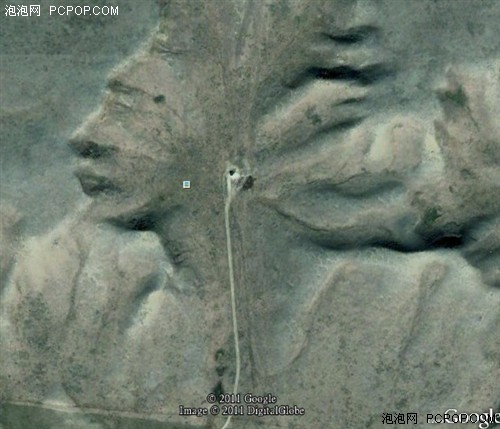 从这幅图中,你看到了什么?你也许会认为这是印在地面上的约翰-特拉沃尔塔的面孔,你还可能认为它只不过是一片沙地而已。但可以肯定的一个事实是,它确实存在于美国拉斯韦加斯51区内。这张清晰的好似外星人面孔的怪异图案可能只是一个偶然形成的现象,但是由于它位于本来就很神秘的51区内,这个事实让它也显得很神秘。在这张人脸上,眉毛、眼睛、鼻子和一个长有山羊胡子的下巴都清晰可见,它的硕大额头让人感到吃惊。所有这一切细节,都尽收谷歌地球的眼中。