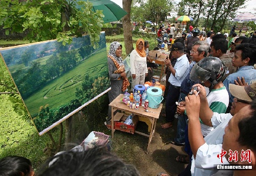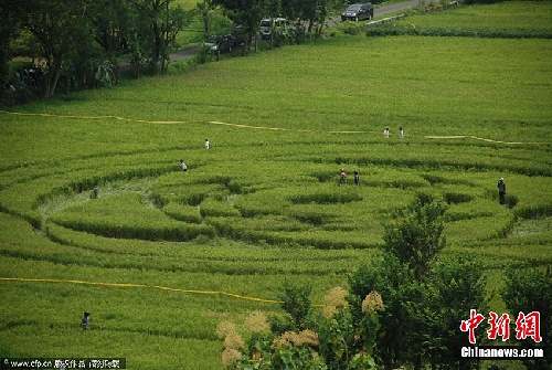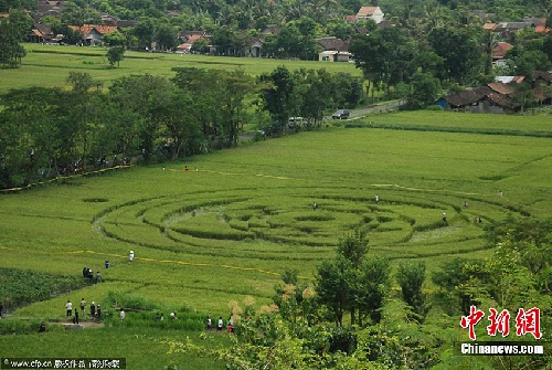1月24日,印度尼西亚日惹特区一个村庄稻田里的怪圈。这个村庄23日突然出现类似“麦田怪圈”的神秘现象,引发各方猜测。出现“麦田怪圈”的村庄名叫约戈迪鲁托,位于日惹特区斯莱曼县。当地村民23日在村子附近的稻田中发现了一个由倒伏的稻株和完好稻株共同构成的复杂图案。图案总体呈圆形,直径约为70米,内部由规则的环形、扇形及一些不规则图形组成。这是印尼首次出现类似“麦田怪圈”的神秘现象。目前,印尼警方已经介入调查。