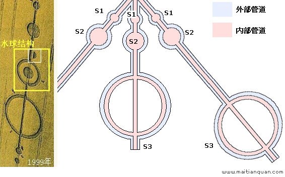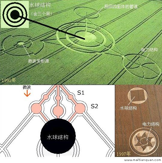 微波源发射出的微波通过大四面体的内部管道,经过6个球体(3个小的3个大的)射向水球结构,下图中的“微波发射源”刚好通过6次弯折后连到中心的“水球结构”,体现了这个过程。另外,“电力结构”和“水球结构”之间的相互关联也能在1997年那两个同时出现的麦田圈中找到证据。