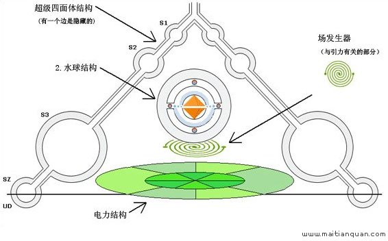 “UFO”的核心结构分为四部分:超级四面体结构、水球结构、电力结构、场发生器。据我理解,大概工作原理是:四大结构之间相互作用,以常见的水作为原料,使水中的分子裂变产生氢原子,再发生聚变等化学变化,从而产生巨大的能量 ……