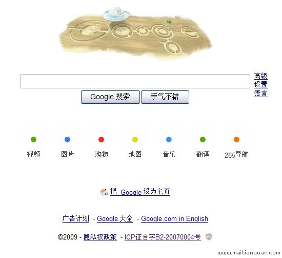 9月15日谷歌中国(www.google.cn)更换了一张“麦田圈”图案的LOGO,官方并未做更多说明,具体用意还有待考证。