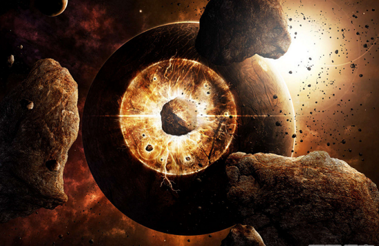 这是艺术家描绘的远古陨石持续碰撞地球,导致地壳粉碎化。