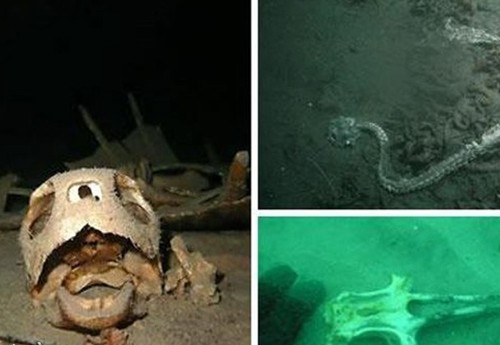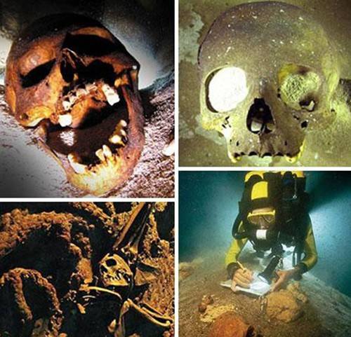 上图中这个恐怖的骷髅头是海底考古学家在墨西哥附近海域,发现的被玛雅人当做祭品处死的人类遗骸,与它一起被发现的还有另外18具人类骸骨。左下角这张图片中,一具几乎完整的人类尸骨被发现躺在一艘沉船船头附近的锚上。这艘船是La Belle号,于1686年在得克萨斯州附近海域沉没。右下角是一具在墨西哥海底洞穴中发现的女性骷髅,她生活在距今1.36万年前,是在美洲发现的年代最为久远的人类尸骨。