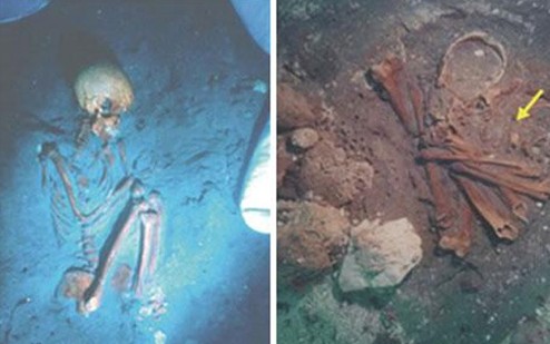 上图是在地中海中被挖掘出的距今9000年前新石器时代的妇女和婴儿遗骸。通过研究,科学家发现死者曾患肺结核。这让他们成为已知最早并被证实的肺结核患者。发现他们的地点距离以色列海岸非常近,那里曾存在一个叫做Atlit-Yam的古代村庄。