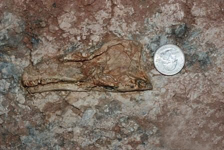 这就是在新疆五彩湾地区新发现的兽脚类恐龙化石,旁边的硬币是用作尺度参照之用的,可以看出这只恐龙非常小