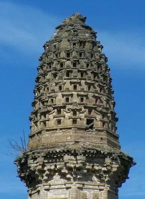 对于这样一所特殊作用的地点,历代都比较重视。现有辽代所建的花塔,为国家级文物保护单位。塔高约10米,整座塔就像倒扣的巨钟,塔龛里没有佛像,雕刻的是着汉代服饰的乐工正在演奏乐器,塔玄洞上方雕刻着八对飞天舞伎,塔的风格与乐坪的文化内涵完全一致。看来,乐坪作为伶伦音乐生涯的所在地,是有根之语。