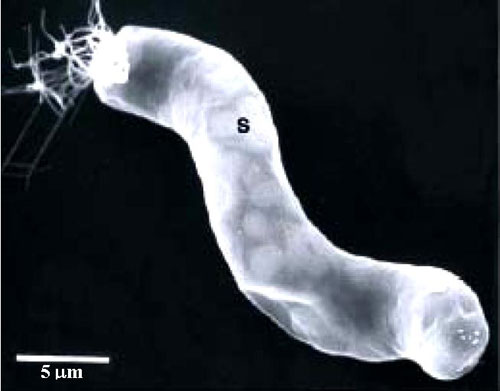 用电子显微镜拍成的Titanospirillum velox巨型细菌的真实画面,与胡佛所发现的“外星微生物”化石相似 |