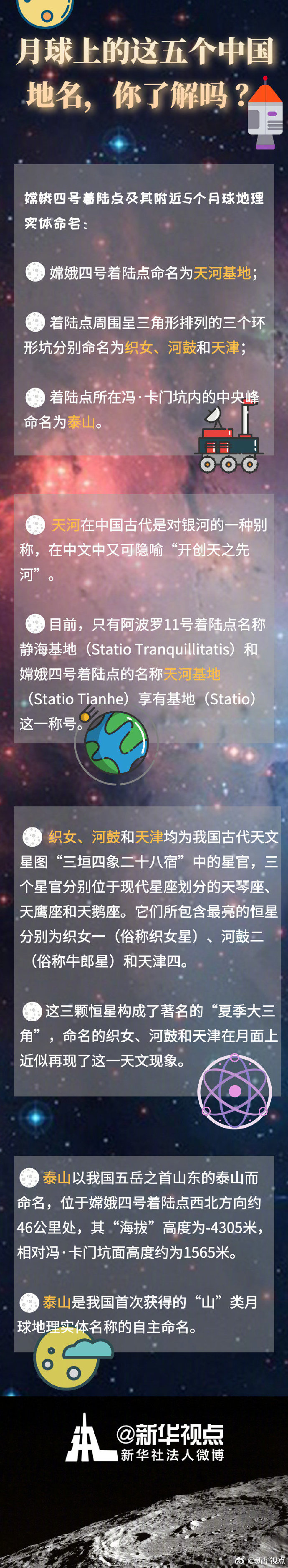 15日,国家航天局、中国科学院和国际天文学联合会向全世界发布了嫦娥四号着陆区域月球地理实体命名:嫦娥四号着陆点命名为天河基地;着陆点周围呈三角形排列的三个环形坑,分别命名为织女、河鼓和天津;着陆点所在冯·卡门坑内的中央峰命名为泰山。
