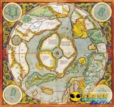 墨卡托1595年制作的北极圈地图。一个巨大的大陆位于北极。此大陆被深深的河流分隔成四块陆地。