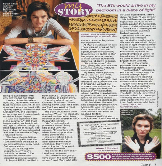 居住在澳洲的特雷西泰勒(Tracy Taylor)从小就留有前世的记忆。从她出生开始就有一位来自猎户座的小灰人指导灵一直照顾着她。特雷西可以回忆起所有在飞船上学习的课程和她来自猎户座星球上各行各色的外星人朋友。特雷西回忆说小时候在文学课上经常写一些赞颂宇宙之美和前世在其他星球上的美好生活。然而她的诗文并没有带来太多正面响应。一次特雷西的文学老师当着全体同学的面说她那“天马行空的奇幻诗文”可能是她在吸食什么不好东西时瞎编出来的。老师的当众挖苦和同学们的取笑深深刺地伤了她的内心。她那不被理解的内心和特殊经历使她开始反抗传统教育体系,她从A学生变成了D学生。特雷西长大成为职业模特之后才被大众接受,慢慢融入回社会。但是外表的光鲜和周围人的众星捧月并不能够给她带来内心的苦闷。她决定勇敢地向社会公布自己是外星人接触者的事实,并且多次在接受采访时讲述自己与猎户座小灰人那段亲人似的情感。