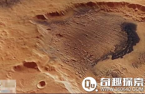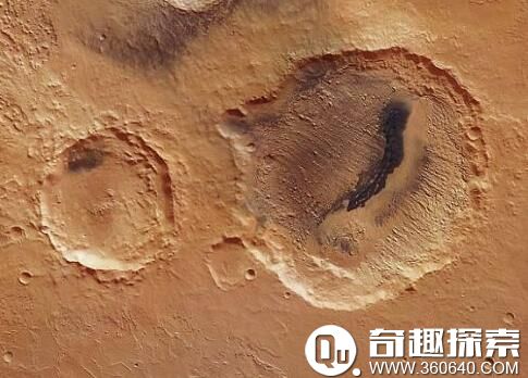 其中一个陨石坑尤其展示了沉积物的黑色痕迹。科学家认为,这些沉积物先是和一个古老地下水库的水融为一体,然后受到咆哮的火星风的侵蚀。