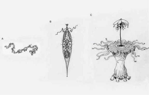 该插图代表外星生命可能经历的不同复杂程度。从没有明显结构的、简单的分子组合(A),到经历了自然选择的、类似细胞的简单生命结构(B),再到能够合作完成复杂任务的外星人(C)。