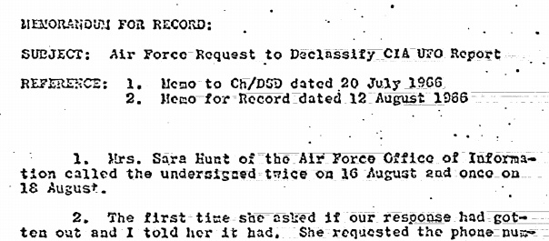 此前,美国中央情报局(CIA)于今年1月在网上公开了近1300万页机密文件,内容涉及大量UFO调查报告。其中,报告时间为1968年8月19日的一份UFO记录称,1968年7月17日在中国福建、江西和广东三个省相继出现了七个UFO。一份1953年UFO调查分析记录写道,当年1月,科学家对1952年7月2日美国犹他州及1950年8月15日蒙大拿州的UFO目击报告进行了分析,结果认为那些类似UFO的光球对国家安全没有威胁。此外,CIA的报告甚至还对中国古代的相关UFO目击史料也有收录。