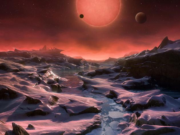 图中是艺术家描绘的一颗系外行星表面结构,这颗行量体积的表面温度分别类似于金星和地球,像这样的系外行星将成为天文学家搜寻地外生命的理想目标之一。