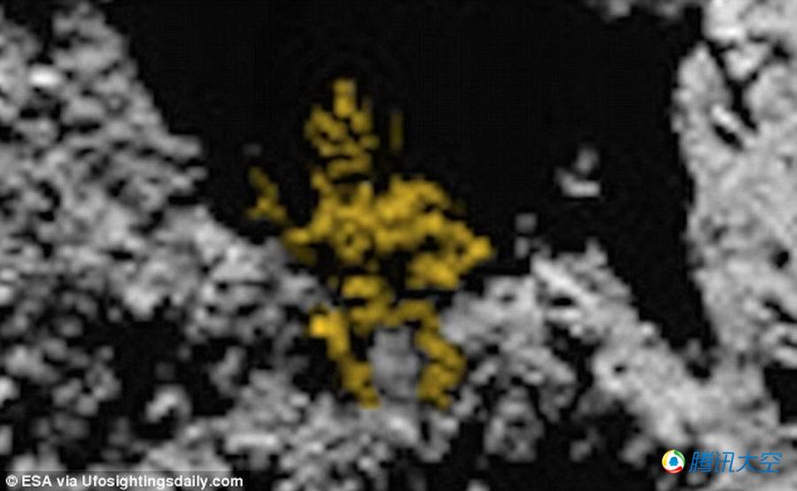 所谓外星人猎手,不过是一些外星人爱好者,对美国宇航局或者其它航空局的影视,图片进行分析。从而发现外星人的痕迹。此前有外星人猎手发现了火星上是女神图片,人像图片,人脸图片,还有如汤勺的器皿,骨头等等。但是最终都被证实是阴影,岩石,巧合等等其它的东西。而最近外星人猎手通过欧航局的图片发现了“钢铁侠”。下图的黄色标示部分。还有黄色狮子……小编真心很佩服外星人猎手的想象力。