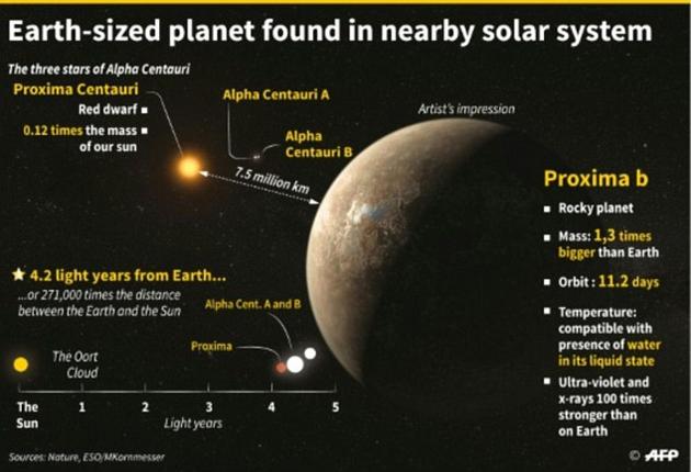 今年8月,科学家宣布发现了比邻星B。它所围绕的中央恒星是该恒星系中最小的一颗。该行星上可能存在海洋,甚至可能有适宜生命存活的自然条件。它处于半人马座比邻星的宜居带中,到地球的距离约为4光年。据估计,它的质量约为地球的1.3倍,距中央恒星约750万公里,大约是水星到太阳距离的十分之一。(叶子)