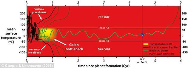 在Aditya Chopra博士等人提出的“盖亚瓶颈”(Gaian Bottleneck)模型中,行星需要有生命存活才能保持宜居状态。因此,即使生命的出现比较普遍,但生命的延续却很罕见。