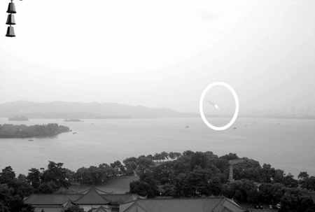 作者自述:这是在塔顶欣赏西湖美景时拍的,后来发现照片中的湖上有一个UFO。拿出来大家看看,大家说说,这到底是什么东西?会不会是前两天央视在《探索·发现》栏目中播出的那种神秘的“飞棍”哦?(都市快报)
