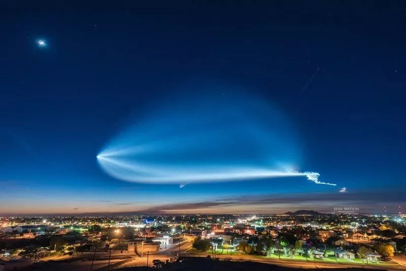 SpaceX 猎鹰9号火箭在美国加利福尼亚范登堡空军基地发射。而发射地点恰巧在摄影师Jesse Watson的家乡Yuma镇附近。
