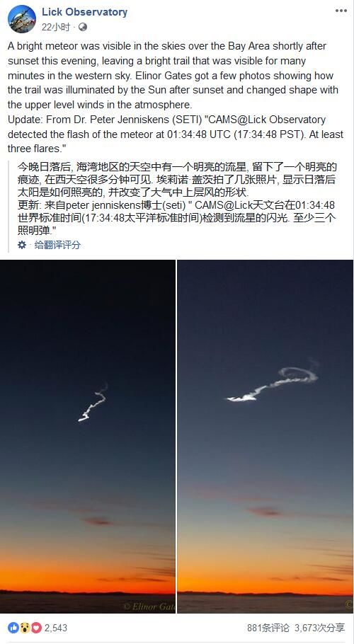 甚至在推特上有用户启用了#UFO标签,并将其称之为UFO发出的光线。然而现实可能并不太令人兴奋:那天晚上虽然没有火箭发射,但是没有任何严谨的证据表明这是外星飞船造成的。而这些明亮的光线是由于流星造成。根据亮度、摇摆的痕迹以及持续时间, 加利福尼亚州圣何塞的利克天文台正式将这一现象确定为流星。