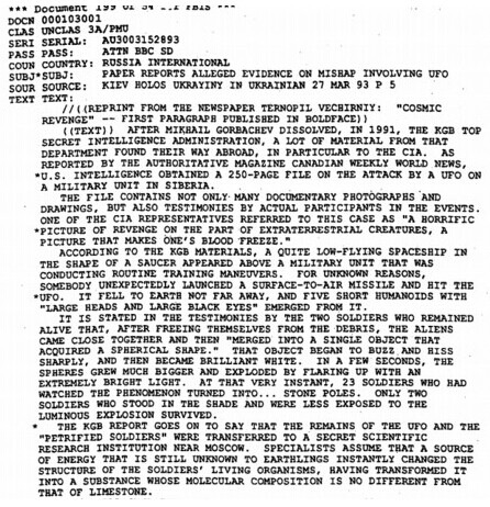 据了解,该份CIA报告写于1993年3月27日,撰文者翻译一篇来自乌克兰的报导后向CIA汇报。报告引述传媒表示,苏联于1991年解体后,大量机密文件流出海外,其中美国情报部门获得一份250页的苏联国家安全局(KGB)机密文件,内容讲述俄军在西伯利亚被外星人袭击,除了有大量纪录照片及图画,更还有生还者的证供。