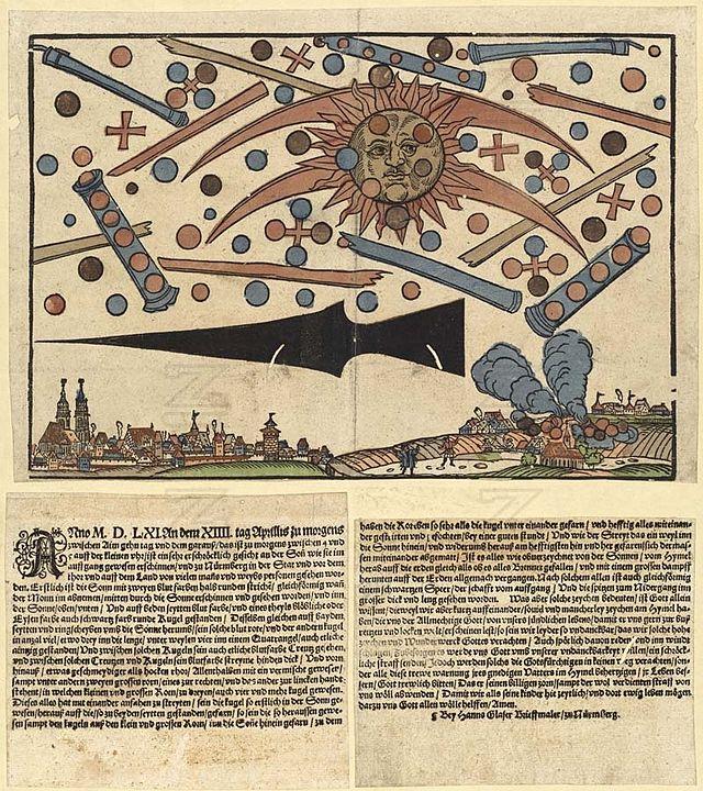 「1561年4月14日清晨,天刚破晓,时间在早上4点到5点之间,一个令人毛骨悚然的异像发生在太阳之下纽伦堡城市的上空,被许多这个国家的男男女女于外出前给撞见了。一开始是在太阳的中间,出现了两个血红色的半圆弧形,就像是下弦月形状的东西,在太阳内部以及上方,下方和两边处的颜色是血红色,然后出现部份模糊部份黑铁色圆形的球体停留在那
